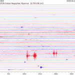 - 05:52 กราฟแผ่นดินไหว ช่วง 24 ชั่วโมงที่ผ่านมา บันทึกจากสถานีกรุงเนปิดอว์ ประเทศพม่า (กราฟนี้เน้นใช้ประโยชน์เรื่องของเวลาที่เกิดแผ่นดินไหว โดยแยกสีเป็นแดงน้ำเงินสีละครึ่งชั่วโมงเพื่อให้ดูง่าย ส่วนเรื่องขนาดแผ่นดินไหว กราฟนี้ไม่อาจใช้ระบุตัวเลขที่ชัดเจน)