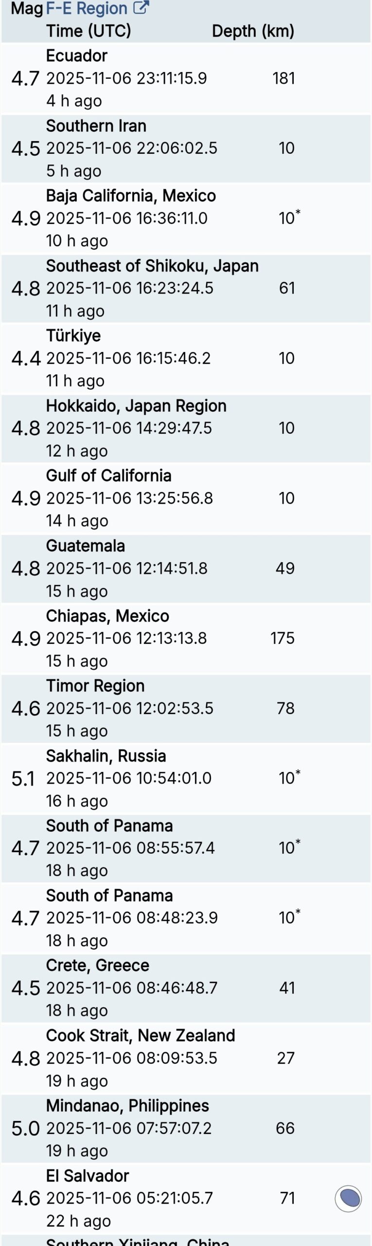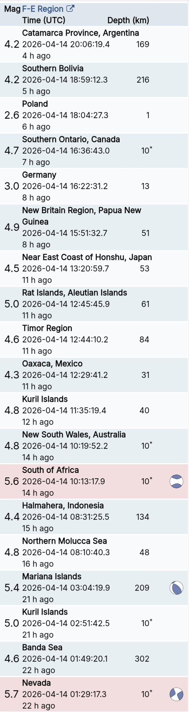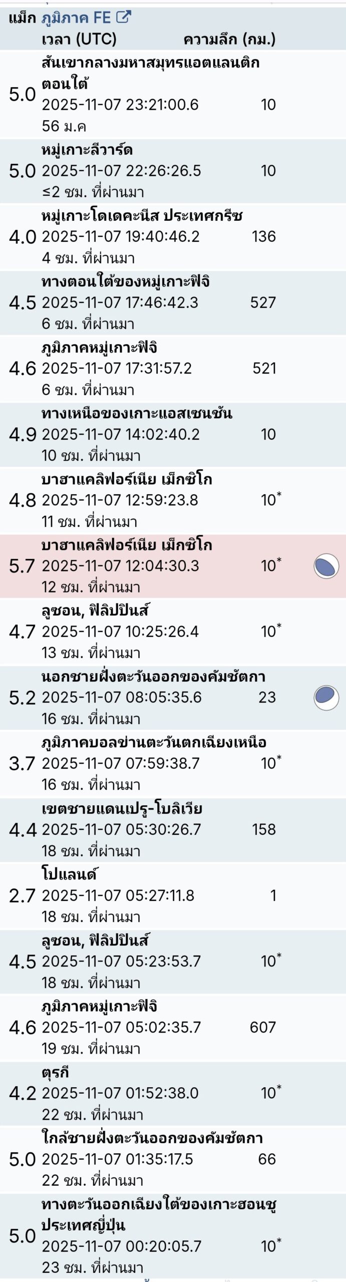 สรุปรายการแผ่นดินไหวและอาฟเตอร์ช็อกทั่วโลกจาก Geofon เยอรมนี ช่วง 07:00 เมื่อวานนี้ ถึง 07:00 เช้าวันนี้ (เวลาในตารางเป็น UTC ต้องบวก 7 ชั่วโมงให้เป็นเวลาไทย)