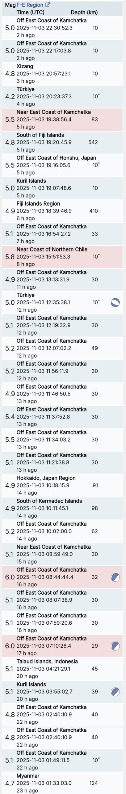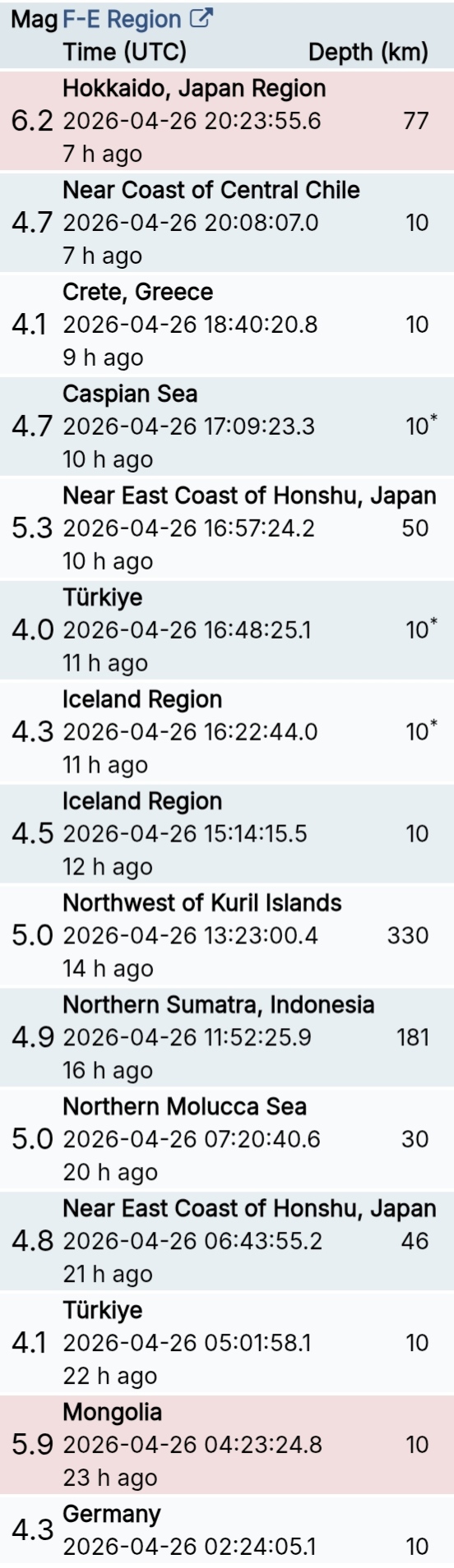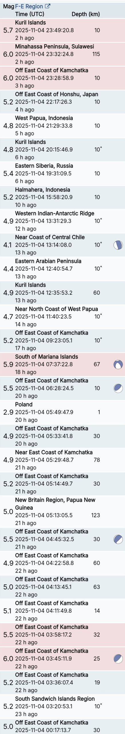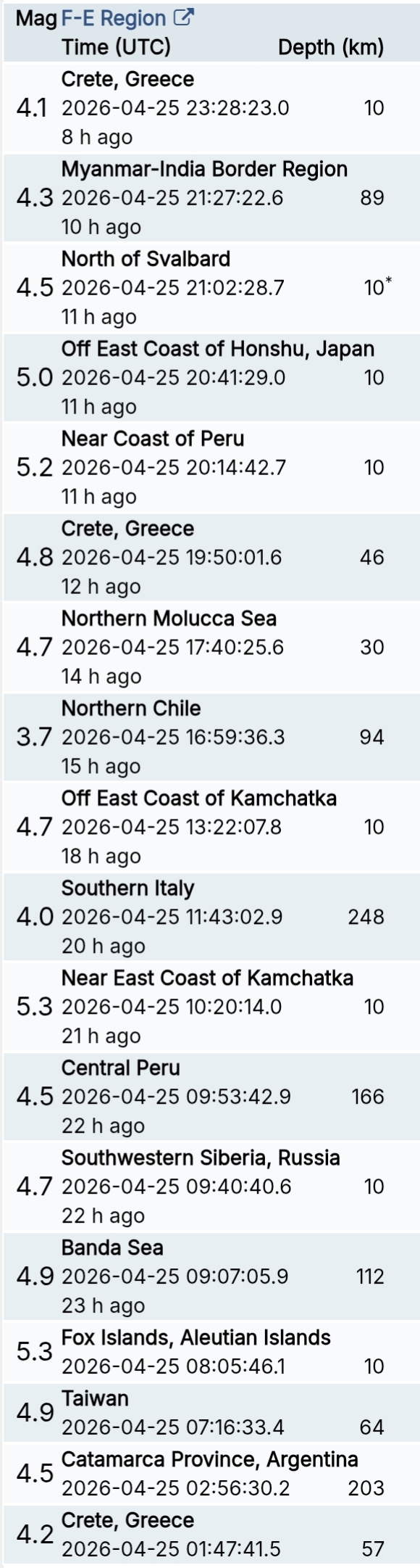 สรุปรายการแผ่นดินไหวและอาฟเตอร์ช็อกทั่วโลกจาก Geofon เยอรมนี ช่วง 07:00 เมื่อวานนี้ ถึง 07:00 เช้าวันนี้ (เวลาในตารางเป็น UTC ต้องบวก 7 ชั่วโมงให้เป็นเวลาไทย)