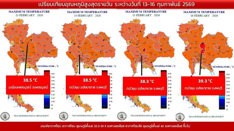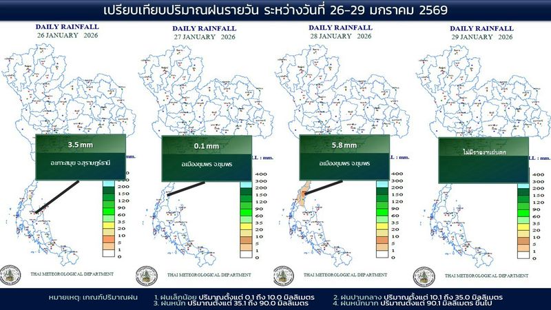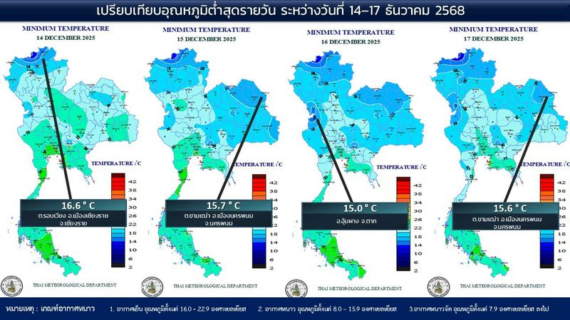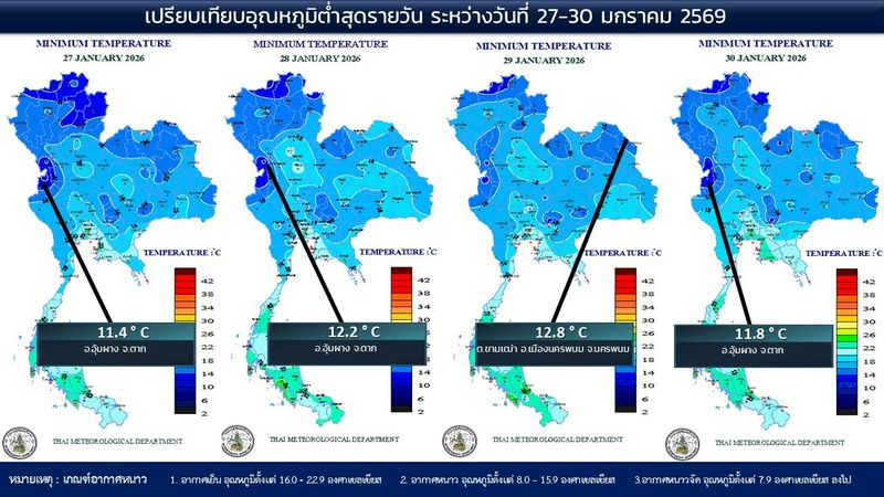 - 07:00 แผนที่เปรียบเทียบอุณหภูมิต่ำสุดในประเทศไทยรอบ 24 ชั่วโมงย้อนหลัง 4 วัน