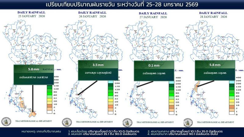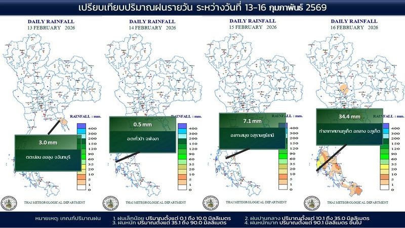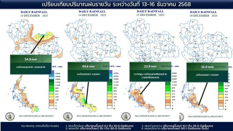 - 07:00 แผนที่เปรียบเทียบพื้นที่ที่มีปริมาณฝนสูงสุดในประเทศไทยรอบ 24 ชั่วโมงย้อนหลัง 4 วัน