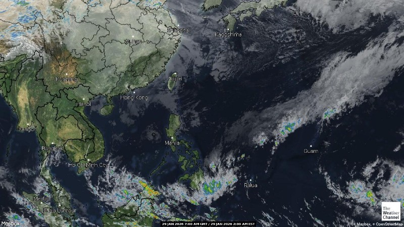 - 05:00 ภาพดาวเทียมย้อมสีจาก TWC แสดงกลุ่มฝนในเอเชียตะวันออกเฉียงใต้และโซนตะวันตกของมหาสมุทรแปซิฟิกเวลานี้