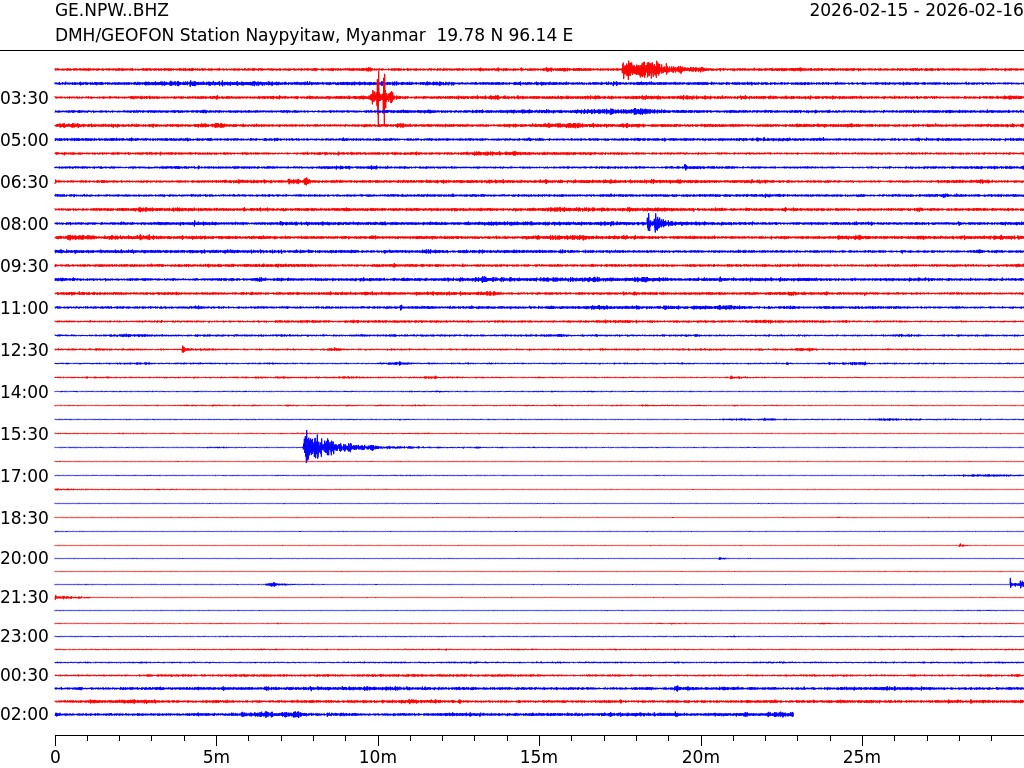 - 09:23 กราฟแผ่นดินไหว ช่วง 24 ชั่วโมงที่ผ่านมา บันทึกจากสถานีกรุงเนปิดอว์ ประเทศพม่า (กราฟนี้เน้นใช้ประโยชน์เรื่องของเวลาที่เกิดแผ่นดินไหว โดยแยกสีเป็นแดงน้ำเงินสีละครึ่งชั่วโมงเพื่อให้ดูง่าย ส่วนเรื่องขนาดแผ่นดินไหว กราฟนี้ไม่อาจใช้ระบุตัวเลขที่ชัดเจน)