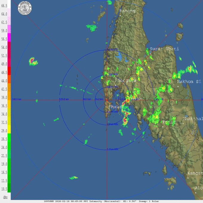 - 17:00 เรดาร์ตรวจอากาศ TMD แบบเคลื่อนไหว รัศมี 240 กม. ศูนย์กลางที่ ภูเก็ต แสดงกลุ่มฝนตลอด 1 ชั่วโมง 15 นาที ที่ผ่านมา