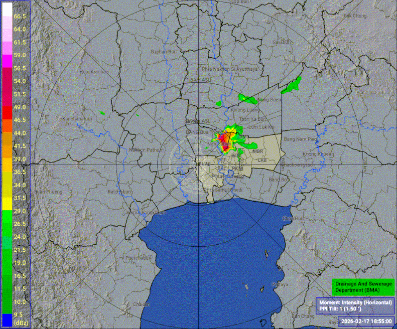 - 19:50 เรดาร์ตรวจฝนจากสำนักการระบายน้ำ กทม ที่หนองแขม (แบบเคลื่อนไหว) แสดงกลุ่มฝนที่ตกในกรุงเทพฯและปริมณฑลรวมทั้งบางจังหวัดในภาคกลางตอนล่างและภาคตะวันออกตลอด 55 นาทีที่ผ่านมา