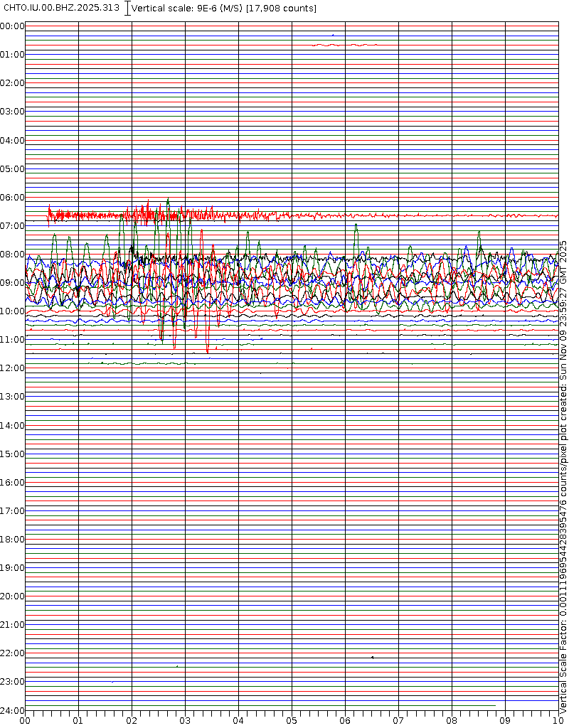 • 06:59 กราฟแผ่นดินไหวชนิดที่ใช้ดูเวลาเกิดเหตุเป็นหลัก แสดงภาพตามแนวตั้ง (BHZ) จากสถานีเครือข่าย IRIS สาขาเชียงใหม่ (CHTO) จาก 07:00 เช้าเมื่อวานนี้จนถึงเวลานี้ เส้นกราฟตามแนวนอนเส้นละ 10 นาที แยกสีเส้นกราฟเพื่อให้ดูได้ง่าย ช่องแบ่งตามแนวตั้งช่องละ 1 นาที