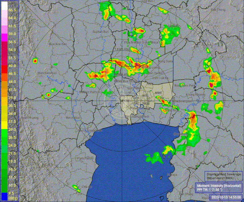 - 15:50 เรดาร์ตรวจฝนจากสำนักการระบายน้ำ กทม ที่หนองแขม (แบบเคลื่อนไหว) แสดงกลุ่มฝนที่ตกในกรุงเทพฯและปริมณฑลรวมทั้งบางจังหวัดในภาคกลางตอนล่างและภาคตะวันออกตลอด 55 นาทีที่ผ่านมา