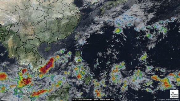 - 04:00 ภาพดาวเทียมย้อมสีจาก TWC แสดงกลุ่มฝนในเอเชียตะวันออกเฉียงใต้และโซนตะวันตกของมหาสมุทรแปซิฟิกเวลานี้