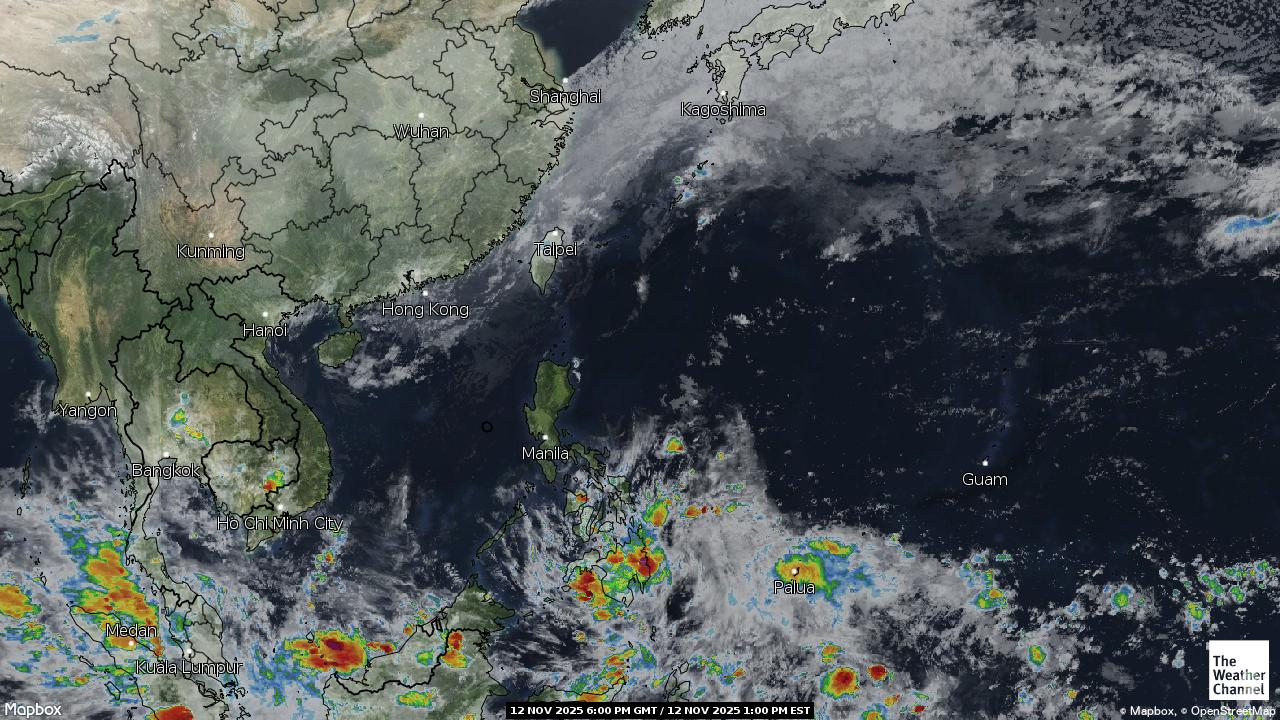 - 01:00 ภาพดาวเทียมย้อมสีจาก TWC แสดงกลุ่มฝนในเอเชียตะวันออกเฉียงใต้และโซนตะวันตกของมหาสมุทรแปซิฟิกเวลานี้