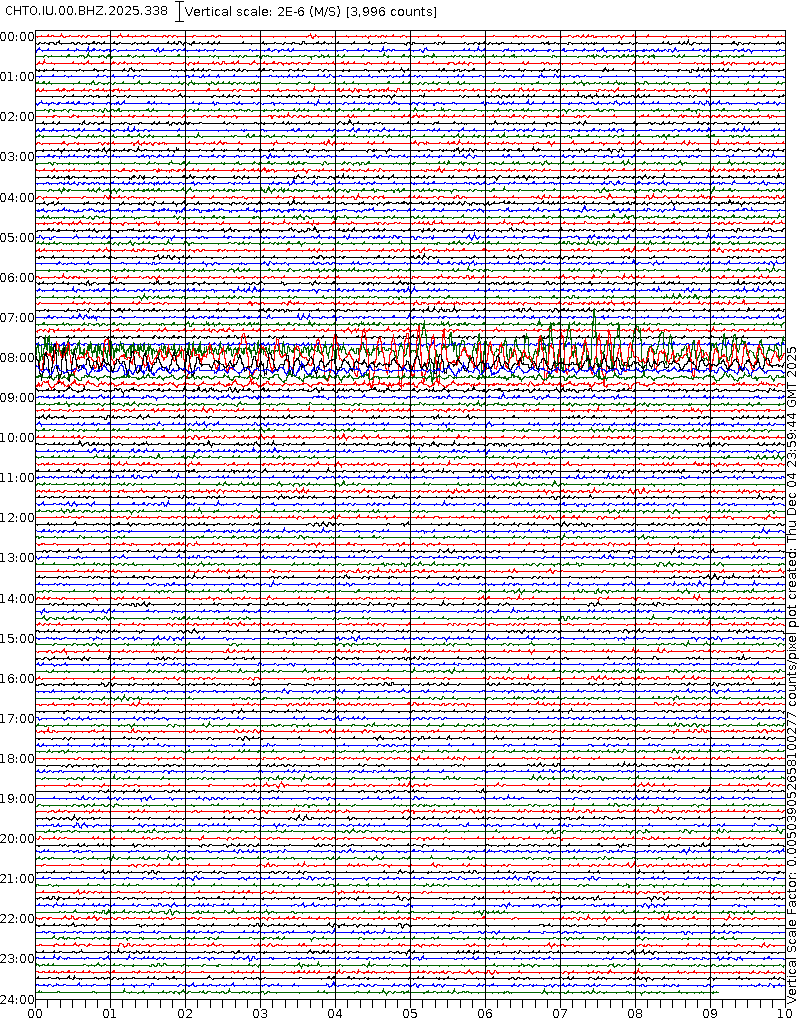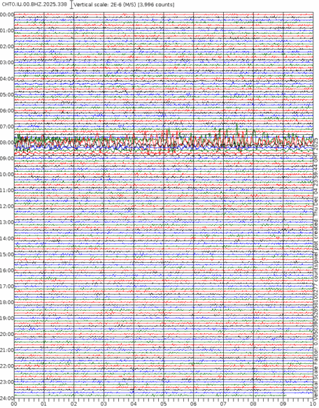 - 06:59 กราฟแผ่นดินไหวชนิดที่ใช้ดูเวลาเกิดเหตุเป็นหลัก แสดงภาพตามแนวตั้ง (BHZ) จากสถานีเครือข่าย IRIS สาขาเชียงใหม่ (CHTO) จาก 07:00 เช้าเมื่อวานนี้จนถึงเวลานี้ เส้นกราฟตามแนวนอนเส้นละ 10 นาที แยกสีเส้นกราฟเพื่อให้ดูได้ง่าย ช่องแบ่งตามแนวตั้งช่องละ 1 นาที