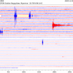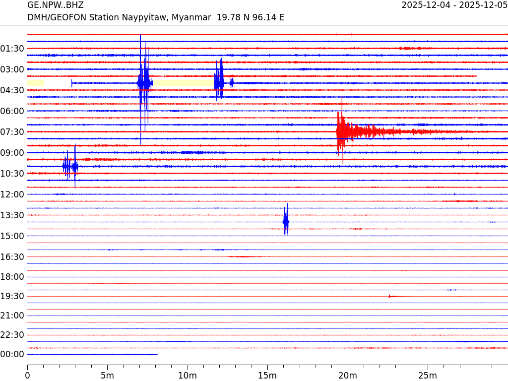 - 07:13 กราฟแผ่นดินไหว ช่วง 24 ชั่วโมงที่ผ่านมา บันทึกจากสถานีกรุงเนปิดอว์ ประเทศพม่า (กราฟนี้เน้นใช้ประโยชน์เรื่องของเวลาที่เกิดแผ่นดินไหว โดยแยกสีเป็นแดงน้ำเงินสีละครึ่งชั่วโมงเพื่อให้ดูง่าย ส่วนเรื่องขนาดแผ่นดินไหว กราฟนี้ไม่อาจใช้ระบุตัวเลขที่ชัดเจน)