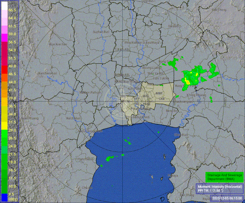 - 07:10 เรดาร์ตรวจฝนจากสำนักการระบายน้ำ กทม ที่หนองแขม (แบบเคลื่อนไหว) แสดงกลุ่มฝนที่ตกในกรุงเทพฯและปริมณฑลรวมทั้งบางจังหวัดในภาคกลางตอนล่างและภาคตะวันออกตลอด 55 นาทีที่ผ่านมา