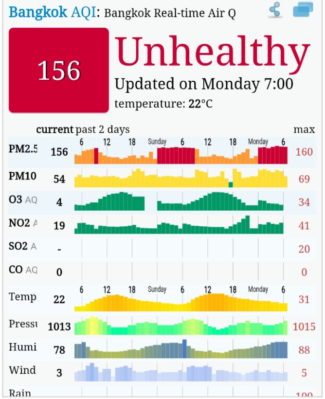 • 07:00 ปริมาณฝุ่นขนาด PM2.5 ในกรุงเทพฯ เวลานี้ มีค่า 66 µg/m³ ดัชนีคุณภาพอากาศ หรือ AQI=156 เกินค่ามาตรฐาน อยู่ในโซนแดง
