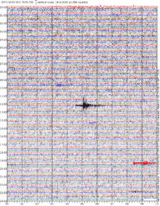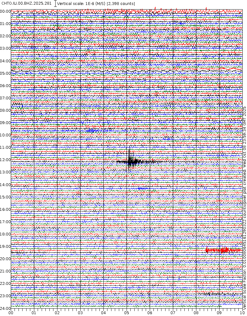 - 06:59 กราฟแผ่นดินไหวชนิดที่ใช้ดูเวลาเกิดเหตุเป็นหลัก แสดงภาพตามแนวตั้ง (BHZ) จากสถานีเครือข่าย IRIS สาขาเชียงใหม่ (CHTO) จาก 07:00 เช้าเมื่อวานนี้จนถึงเวลานี้ เส้นกราฟตามแนวนอนเส้นละ 10 นาที แยกสีเส้นกราฟเพื่อให้ดูได้ง่าย ช่องแบ่งตามแนวตั้งช่องละ 1 นาที