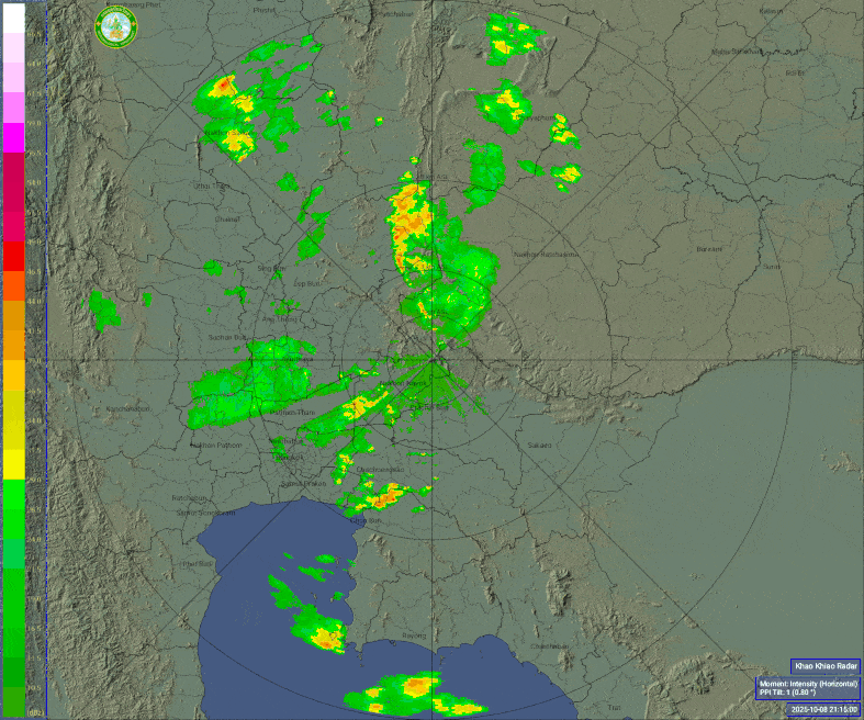- 05:30 เรดาร์ตรวจอากาศ TMD แบบเคลื่อนไหว รัศมี 240 กม. ศูนย์กลางที่ จ.นครนายก แสดงกลุ่มฝนตลอด 1 ชั่วโมง 15 นาที ที่ผ่านมา