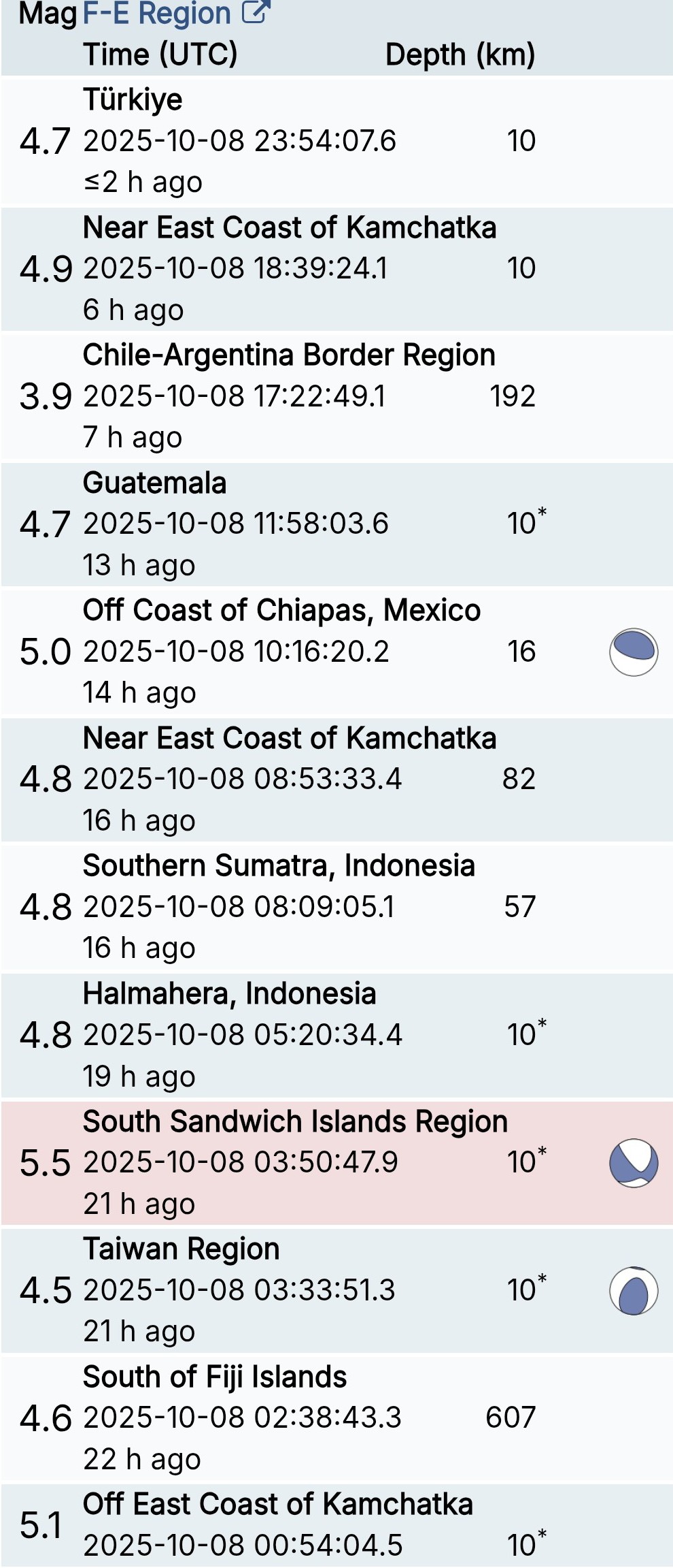 สรุปรายการแผ่นดินไหวและอาฟเตอร์ช็อกทั่วโลกจาก Geofon เยอรมนี ช่วง 07:00 เมื่อวานนี้ ถึง 07:00 เช้าวันนี้ (เวลาในตารางเป็น UTC ต้องบวก 7 ชั่วโมงให้เป็นเวลาไทย)
