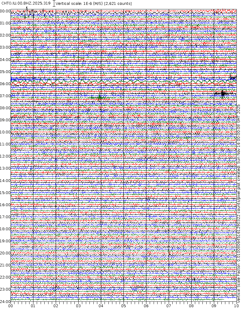 - 06:59 กราฟแผ่นดินไหวชนิดที่ใช้ดูเวลาเกิดเหตุเป็นหลัก แสดงภาพตามแนวตั้ง (BHZ) จากสถานีเครือข่าย IRIS สาขาเชียงใหม่ (CHTO) จาก 07:00 เช้าเมื่อวานนี้จนถึงเวลานี้ เส้นกราฟตามแนวนอนเส้นละ 10 นาที แยกสีเส้นกราฟเพื่อให้ดูได้ง่าย ช่องแบ่งตามแนวตั้งช่องละ 1 นาที