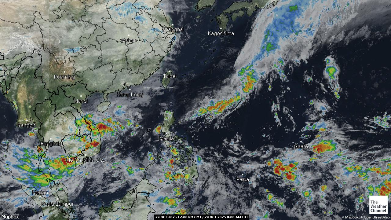 • 19:00 ภาพดาวเทียมย้อมสีจาก TWC แสดงกลุ่มฝนในเอเชียตะวันออกเฉียงใต้และโซนตะวันตกของมหาสมุทรแปซิฟิกเวลานี้