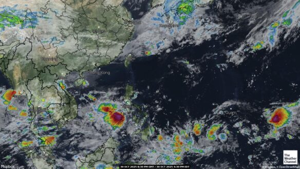 - 03:30 ภาพดาวเทียมย้อมสีจาก TWC แสดงกลุ่มฝนในเอเชียตะวันออกเฉียงใต้และโซนตะวันตกของมหาสมุทรแปซิฟิกเวลานี้