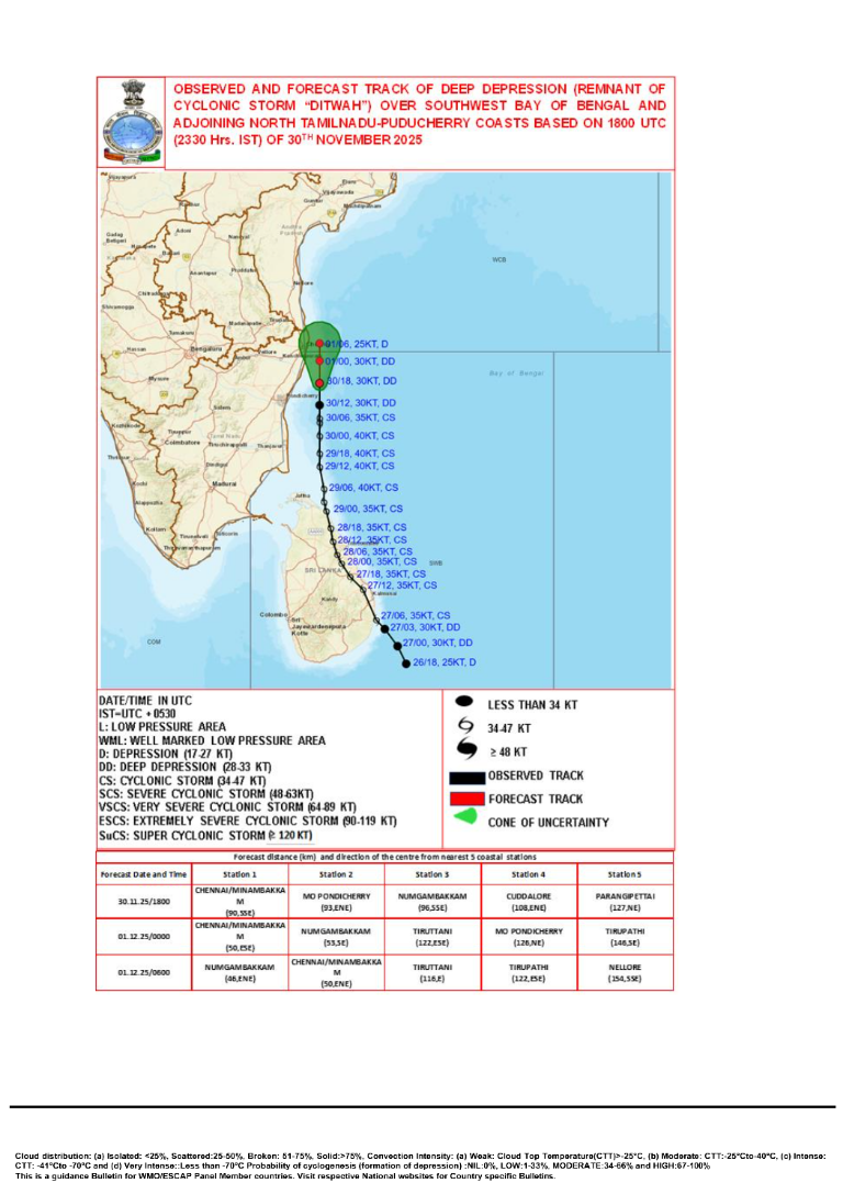 - 01:00 พายุไซโคลน ดิตวะฮ์ ديطوح Ditwah มีพิกัดล่าสุดอยู่ที่ 11.9°N 81.5°E ตอนเหนือของศรีลึ ในอ่าวเบงกอล ความเร็วลมใกล้ศูนย์กลางลดลงเหลือ 25 น็อต ความกดอากาศ 1004 mb และจากการขึ้นฝั่งศรีลังกาก่อให้เกิดน้ำท่วมใหญ่ มีผู้เสียชีวิต 212 ราย สูญหาย 218 คน และมีประชาชนเกือบ 200,000 คน พักอาศัยอยู่ที่สถานที่พักชั่วคราว 1,275 แห่ง