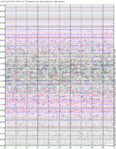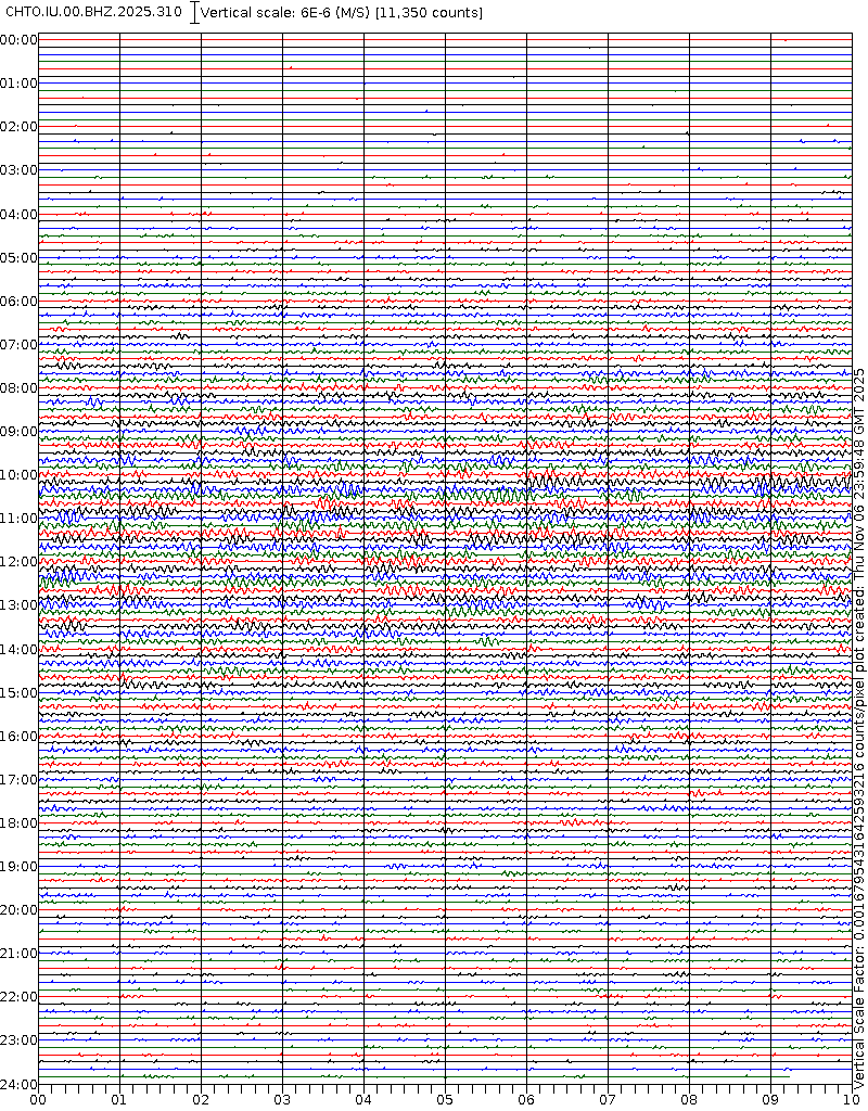 - 06:59 กราฟแผ่นดินไหวชนิดที่ใช้ดูเวลาเกิดเหตุเป็นหลัก แสดงภาพตามแนวตั้ง (BHZ) จากสถานีเครือข่าย IRIS สาขาเชียงใหม่ (CHTO) จาก 07:00 เช้าเมื่อวานนี้จนถึงเวลานี้ เส้นกราฟตามแนวนอนเส้นละ 10 นาที แยกสีเส้นกราฟเพื่อให้ดูได้ง่าย ช่องแบ่งตามแนวตั้งช่องละ 1 นาที