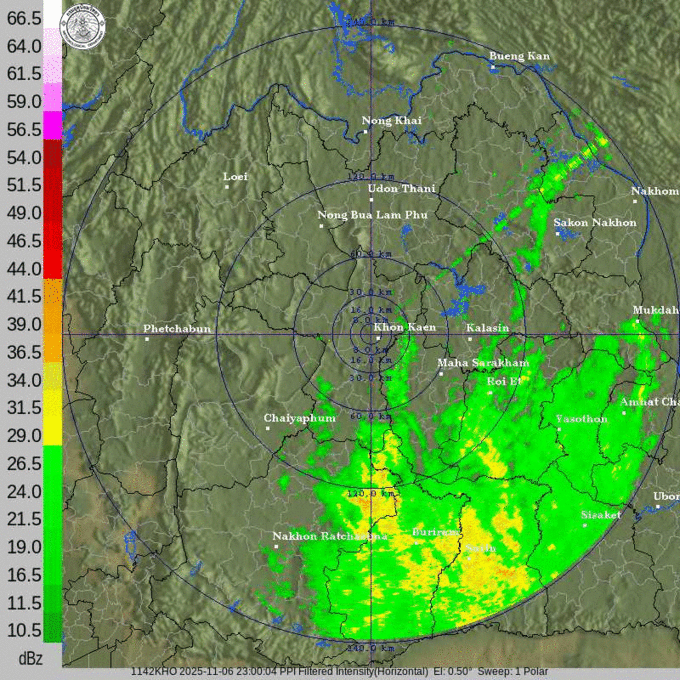 - 05:15 เรดาร์ฝนแบบเคลื่อนไหวรัศมี 240 กม. ศูนย์กลางที่จังหวัดอุบลราชธานี แสดงกลุ่มฝนตลอดช่วง 1 ชั่วโมง 45 นาทีที่ผ่านมา