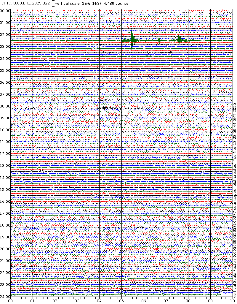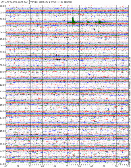 - 06:59 กราฟแผ่นดินไหวชนิดที่ใช้ดูเวลาเกิดเหตุเป็นหลัก แสดงภาพตามแนวตั้ง (BHZ) จากสถานีเครือข่าย IRIS สาขาเชียงใหม่ (CHTO) จาก 07:00 เช้าเมื่อวานนี้จนถึงเวลานี้ เส้นกราฟตามแนวนอนเส้นละ 10 นาที แยกสีเส้นกราฟเพื่อให้ดูได้ง่าย ช่องแบ่งตามแนวตั้งช่องละ 1 นาที