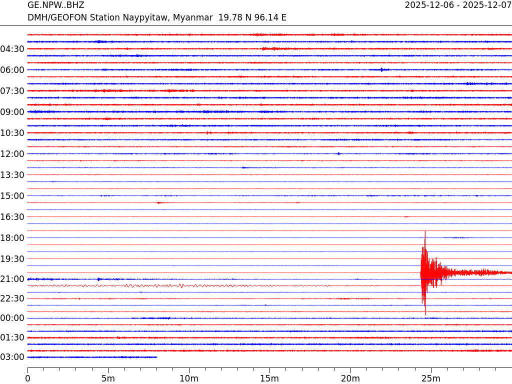 - 10:08 กราฟแผ่นดินไหว ช่วง 24 ชั่วโมงที่ผ่านมา บันทึกจากสถานีกรุงเนปิดอว์ ประเทศพม่า (กราฟนี้เน้นใช้ประโยชน์เรื่องของเวลาที่เกิดแผ่นดินไหว โดยแยกสีเป็นแดงน้ำเงินสีละครึ่งชั่วโมงเพื่อให้ดูง่าย ส่วนเรื่องขนาดแผ่นดินไหว กราฟนี้ไม่อาจใช้ระบุตัวเลขที่ชัดเจน)