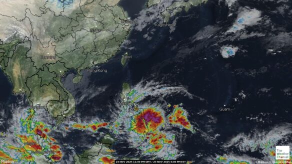 - 06:00 ภาพดาวเทียมย้อมสีจาก TWC แสดงกลุ่มฝนในเอเชียตะวันออกเฉียงใต้และโซนตะวันตกของมหาสมุทรแปซิฟิกเวลานี้