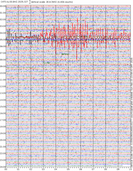 - 06:59 กราฟแผ่นดินไหวชนิดที่ใช้ดูเวลาเกิดเหตุเป็นหลัก แสดงภาพตามแนวตั้ง (BHZ) จากสถานีเครือข่าย IRIS สาขาเชียงใหม่ (CHTO) จาก 07:00 เช้าเมื่อวานนี้จนถึงเวลานี้ เส้นกราฟตามแนวนอนเส้นละ 10 นาที แยกสีเส้นกราฟเพื่อให้ดูได้ง่าย ช่องแบ่งตามแนวตั้งช่องละ 1 นาที