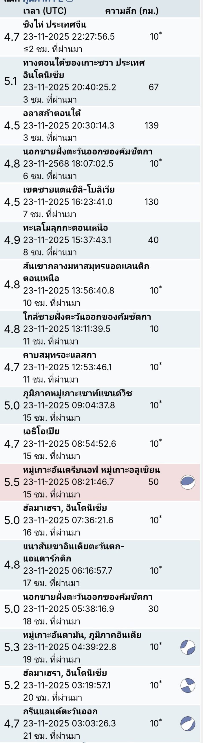 - 06:00 สรุปเหตุการณ์แผ่นดินไหวในประเทศไทยและเพื่อนบ้านตลอด 24 ชั่วโมงที่ผ่านมาที่ตรวจวัดได้โดยกรมอุตุฯ