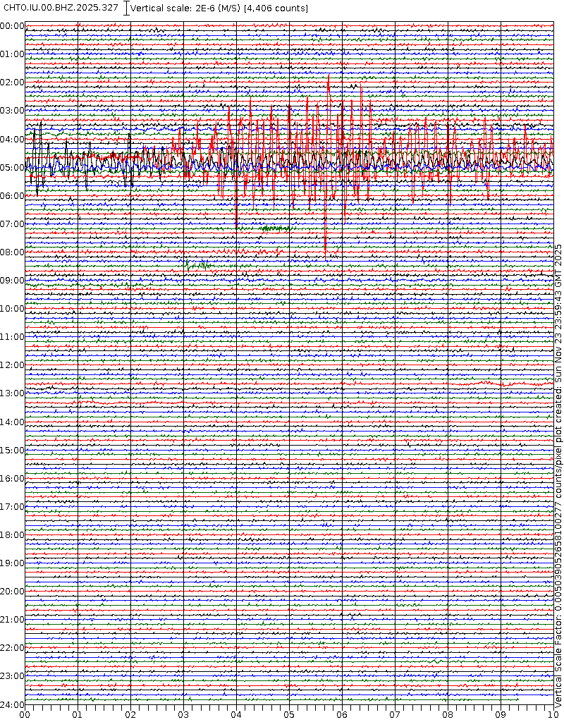 - 06:59 กราฟแผ่นดินไหวชนิดที่ใช้ดูเวลาเกิดเหตุเป็นหลัก แสดงภาพตามแนวตั้ง (BHZ) จากสถานีเครือข่าย IRIS สาขาเชียงใหม่ (CHTO) จาก 07:00 เช้าเมื่อวานนี้จนถึงเวลานี้ เส้นกราฟตามแนวนอนเส้นละ 10 นาที แยกสีเส้นกราฟเพื่อให้ดูได้ง่าย ช่องแบ่งตามแนวตั้งช่องละ 1 นาที