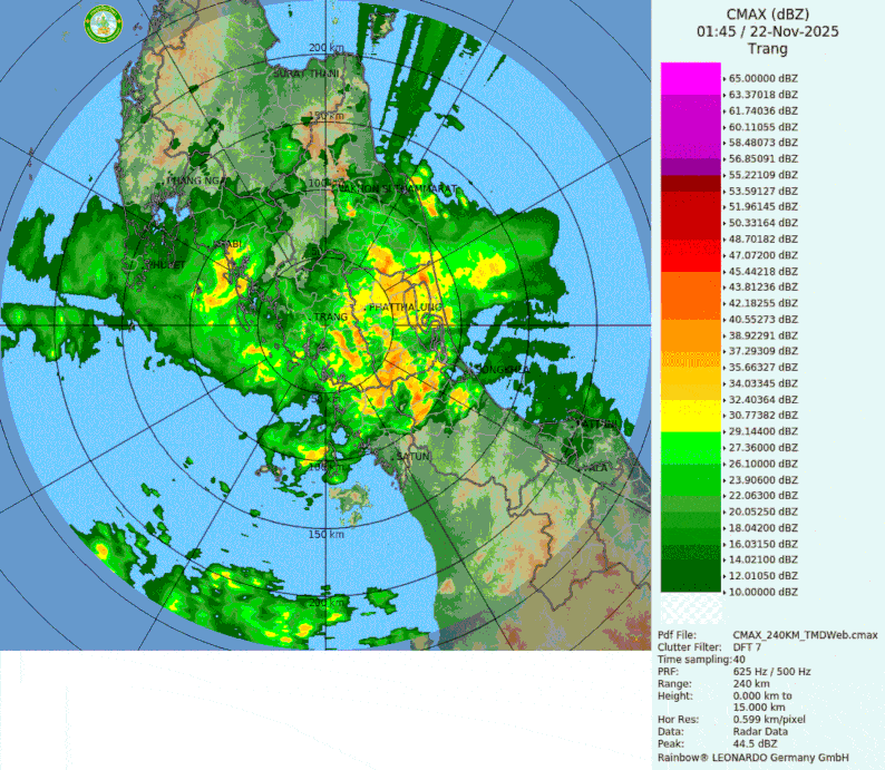 - 07:45 เรดาร์ฝนแบบเคลื่อนไหวรัศมี 240 กม. ศูนย์กลางที่จังหวัดตรัง แสดงกลุ่มฝนตลอดช่วง 1 ชั่วโมง 15 นาทีที่ผ่านมา