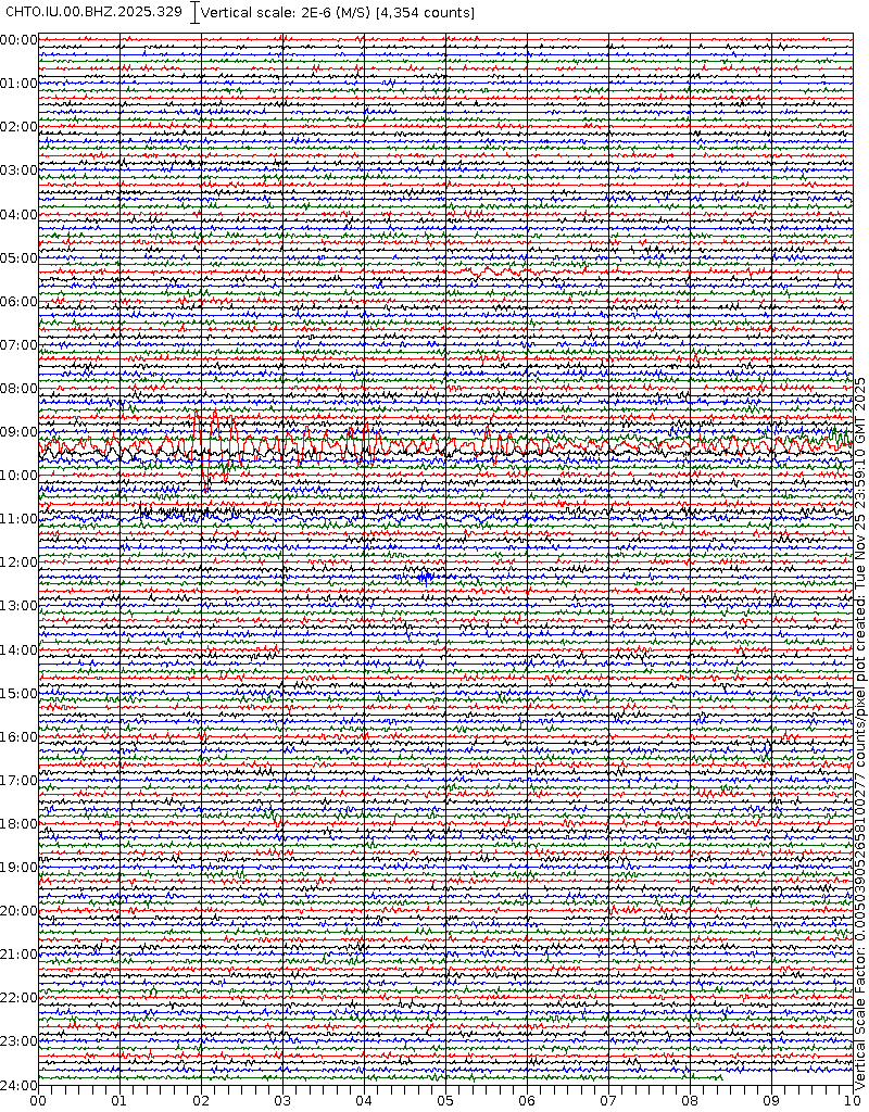 • 06:59 กราฟแผ่นดินไหวชนิดที่ใช้ดูเวลาเกิดเหตุเป็นหลัก แสดงภาพตามแนวตั้ง (BHZ) จากสถานีเครือข่าย IRIS สาขาเชียงใหม่ (CHTO) จาก 07:00 เช้าเมื่อวานนี้จนถึงเวลานี้ เส้นกราฟตามแนวนอนเส้นละ 10 นาที แยกสีเส้นกราฟเพื่อให้ดูได้ง่าย ช่องแบ่งตามแนวตั้งช่องละ 1 นาที
