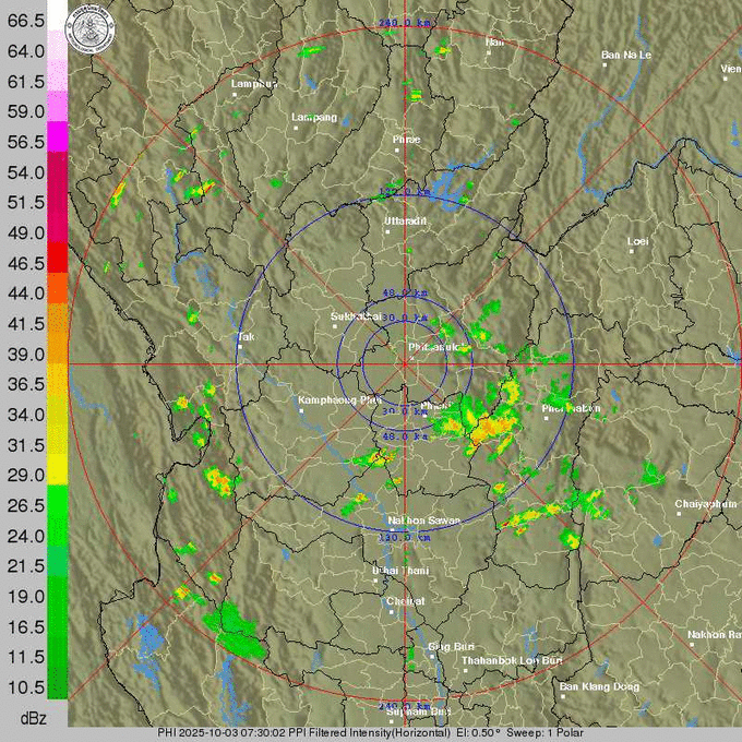 • 04:30 เรดาร์ตรวจอากาศ TMD แบบเคลื่อนไหว รัศมี 240 กม. ศูนย์กลางที่ จ.นครนายก แสดงกลุ่มฝนตลอด 1 ชั่วโมง 15 นาที ที่ผ่านมา