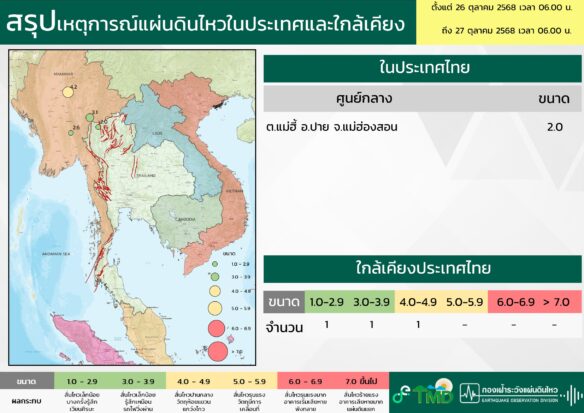 - 06:00 สรุปเหตุการณ์แผ่นดินไหวในประเทศไทยและเพื่อนบ้านตลอด 24 ชั่วโมงที่ผ่านมาที่ตรวจวัดได้โดยกรมอุตุฯ