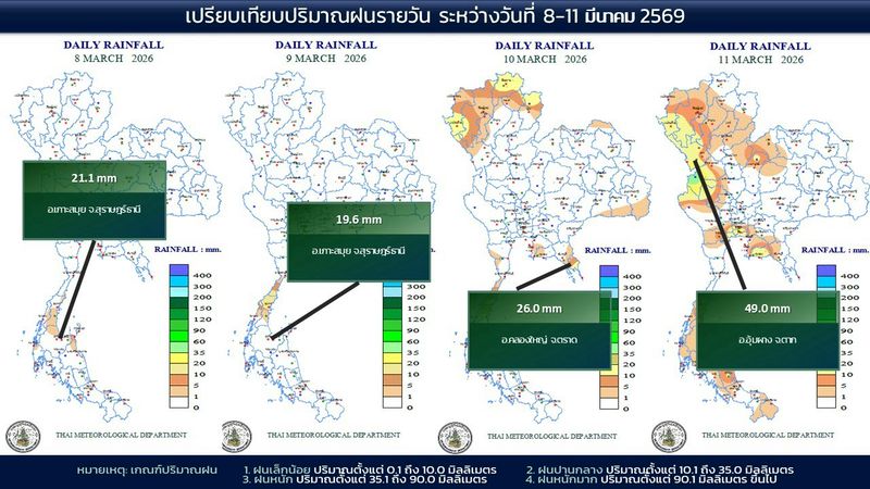 - 07:00 แผนที่เปรียบเทียบพื้นที่ที่มีปริมาณฝนสูงสุดในประเทศไทยรอบ 24 ชั่วโมงย้อนหลัง 4 วัน