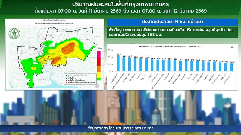 - 07:00 แผนที่แสดงบริเวณและปริมาณฝนตกในเขตกรุงเทพฯ รอบ 24 ชั่วโมงที่ผ่านมา โดย สำนักระบายน้ำ กทม.