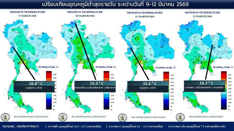 - 07:00 แผนที่เปรียบเทียบอุณหภูมิต่ำสุดในประเทศไทยรอบ 24 ชั่วโมงย้อนหลัง 4 วัน