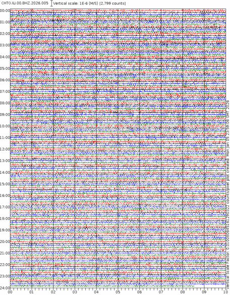 • 06:59 กราฟแผ่นดินไหวชนิดที่ใช้ดูเวลาเกิดเหตุเป็นหลัก แสดงภาพตามแนวตั้ง (BHZ) จากสถานีเครือข่าย IRIS สาขาเชียงใหม่ (CHTO) จาก 07:00 เช้าเมื่อวานนี้จนถึงเวลานี้ เส้นกราฟตามแนวนอนเส้นละ 10 นาที แยกสีเส้นกราฟเพื่อให้ดูได้ง่าย ช่องแบ่งตามแนวตั้งช่องละ 1 นาที
