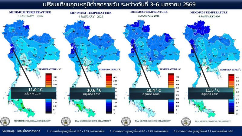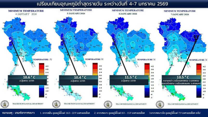 • 07:00 แผนที่เปรียบเทียบอุณหภูมิต่ำสุดในประเทศไทยรอบ 24 ชั่วโมงย้อนหลัง 4 วัน
