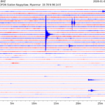 • 09:13 กราฟแผ่นดินไหว ช่วง 24 ชั่วโมงที่ผ่านมา บันทึกจากสถานีกรุงเนปิดอว์ ประเทศพม่า (กราฟนี้เน้นใช้ประโยชน์เรื่องของเวลาที่เกิดแผ่นดินไหว โดยแยกสีเป็นแดงน้ำเงินสีละครึ่งชั่วโมงเพื่อให้ดูง่าย ส่วนเรื่องขนาดแผ่นดินไหว กราฟนี้ไม่อาจใช้ระบุตัวเลขที่ชัดเจน)