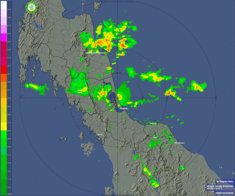 • 07:15 เรดาร์ตรวจอากาศ TMD แบบเคลื่อนไหว รัศมี 240 กม. ศูนย์กลางที่ อ.สทิงพระ แสดงกลุ่มฝนตลอด 1 ชั่วโมง 15 นาที ที่ผ่านมา