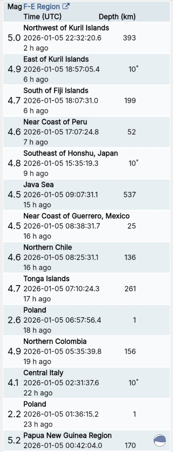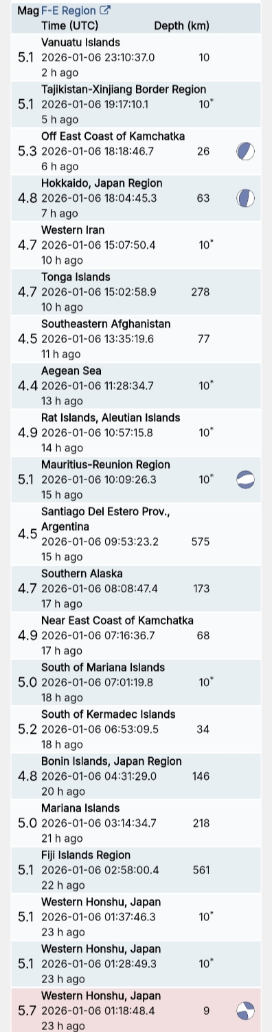 สรุปรายการแผ่นดินไหวและอาฟเตอร์ช็อกทั่วโลกจาก Geofon เยอรมนี ช่วง 07:00 เมื่อวานนี้ ถึง 07:00 เช้าวันนี้ (เวลาในตารางเป็น UTC ต้องบวก 7 ชั่วโมงให้เป็นเวลาไทย)