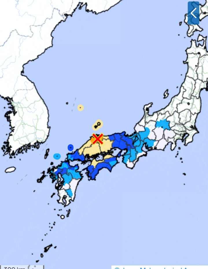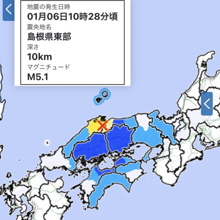 • 08:18 แผ่นดินไหวขนาด 6.2 ลึก 10 กม.พิกัด 35.3°N 133.2°E ฟากตะวันออกของจังหวัดชิมาเนะฟากตะวันออก ความรุนแรงระดับ 5+ ตามมาตราชินโดะ