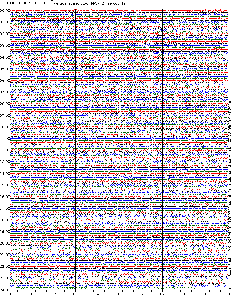 • 06:58 กราฟแผ่นดินไหวชนิดที่ใช้ดูเวลาเกิดเหตุเป็นหลัก แสดงภาพตามแนวตั้ง (BHZ) จากสถานีเครือข่าย IRIS สาขาเชียงใหม่ (CHTO) จาก 07:00 เช้าเมื่อวานนี้จนถึงเวลานี้ เส้นกราฟตามแนวนอนเส้นละ 10 นาที แยกสีเส้นกราฟเพื่อให้ดูได้ง่าย ช่องแบ่งตามแนวตั้งช่องละ 1 นาที