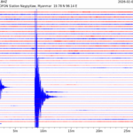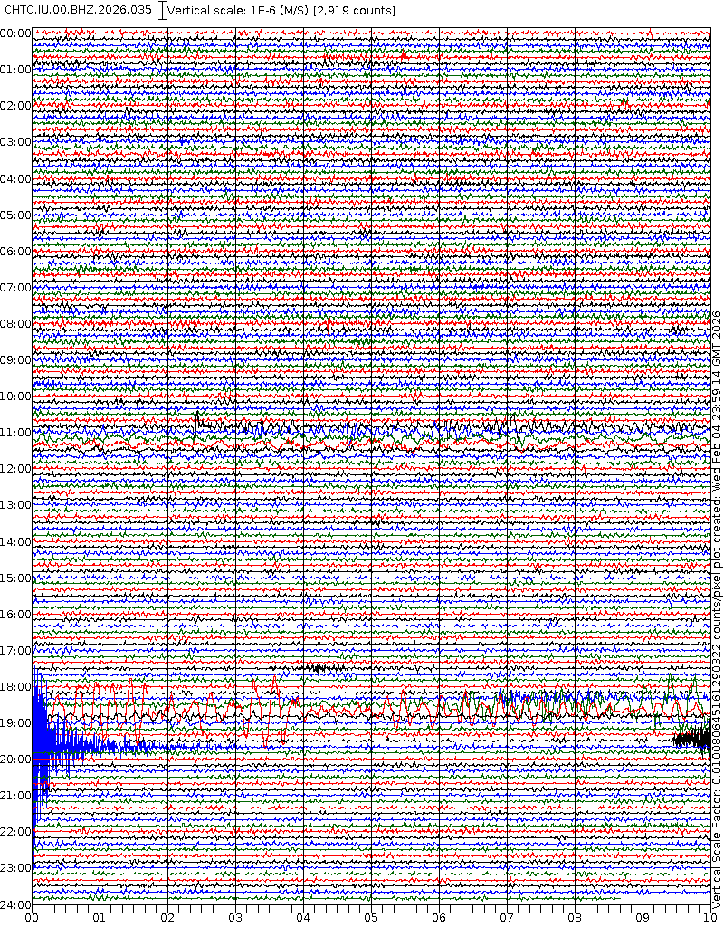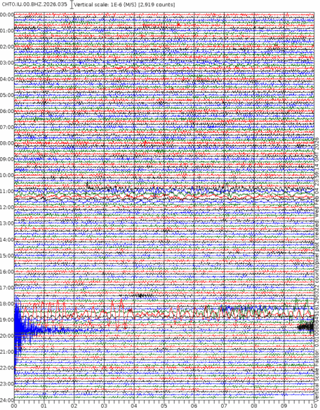 - 06:45 กราฟแผ่นดินไหว ช่วง 24 ชั่วโมงที่ผ่านมา บันทึกจากสถานีกรุงเนปิดอว์ ประเทศพม่า (กราฟนี้เน้นใช้ประโยชน์เรื่องของเวลาที่เกิดแผ่นดินไหว โดยแยกสีเป็นแดงน้ำเงินสีละครึ่งชั่วโมงเพื่อให้ดูง่าย ส่วนเรื่องขนาดแผ่นดินไหว กราฟนี้ไม่อาจใช้ระบุตัวเลขที่ชัดเจน)