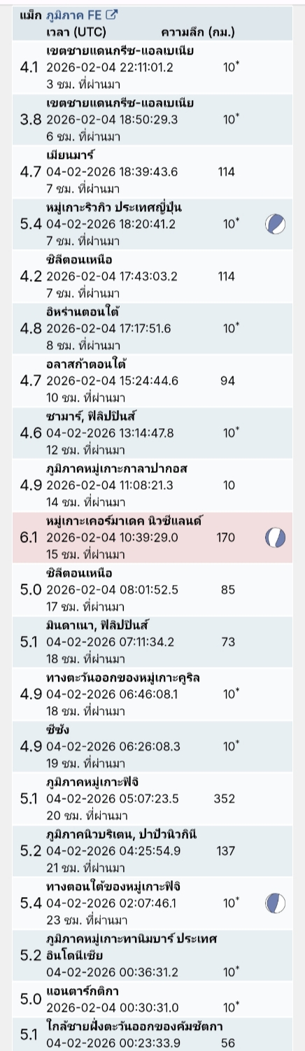 - 06:00 สรุปเหตุการณ์แผ่นดินไหวในประเทศไทยและเพื่อนบ้านตลอด 24 ชั่วโมงที่ผ่านมาที่ตรวจวัดได้โดยกรมอุตุฯ