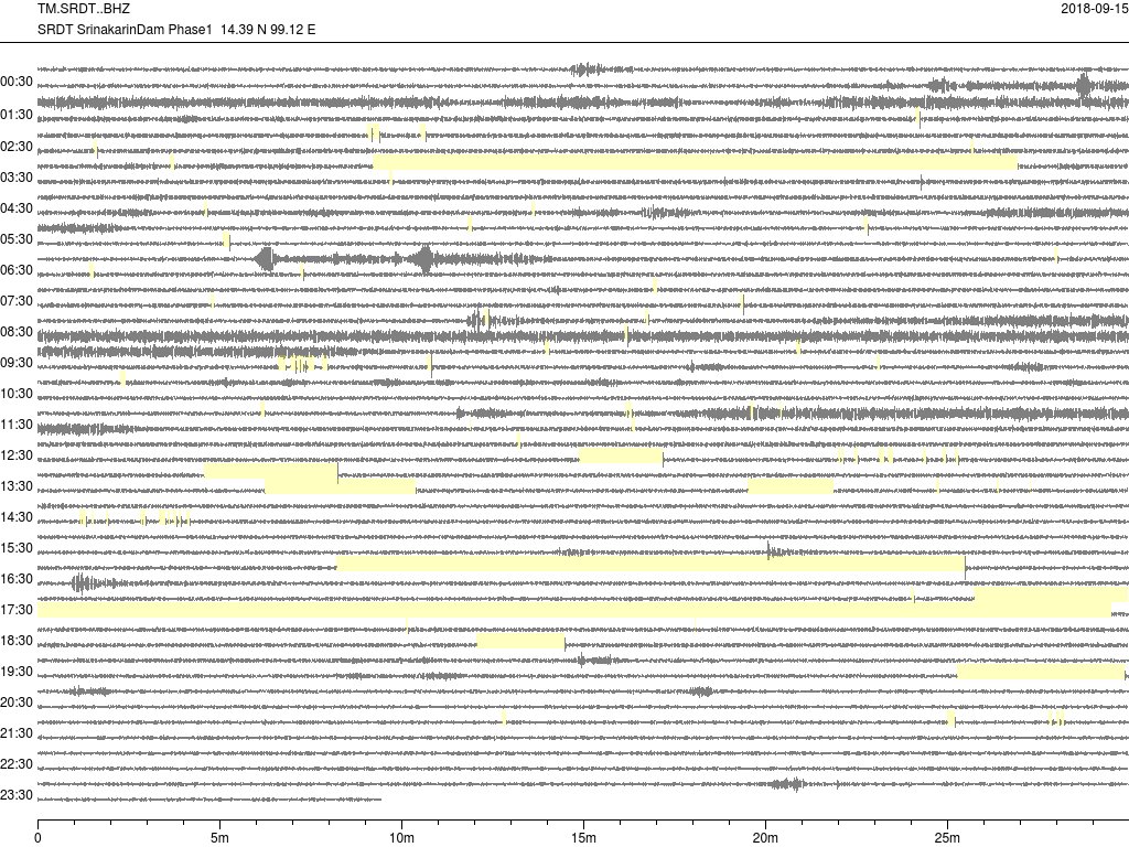 - กราฟแผ่นดินไหวจากสถานี SRDT เขื่อนศรีนครินทร์ ของสำนักเฝ้าระวังฯ กรมอุตุฯ จากเวลา 07:00 เมื่อวานนี้ถึง 07:00 เช้านี้