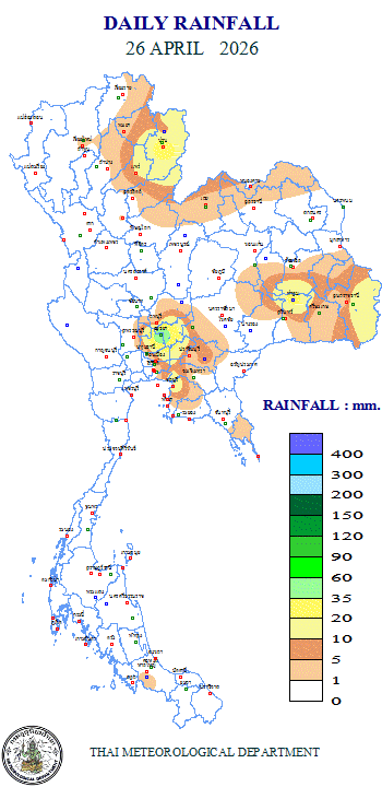 - 07:00 แผนที่แสดงพื้นที่ที่มีปริมาณฝนตกสูงสุดในประเทศไทยตลอด 24 ชั่วโมงที่ผ่านมา